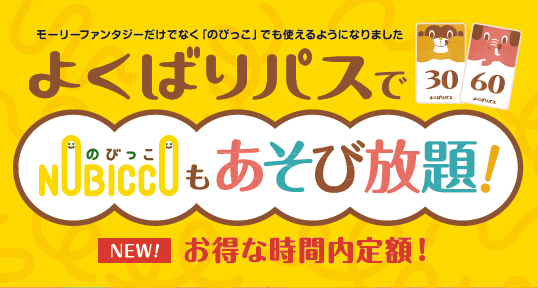 30分600円・60分1200円(いずれも税込価格)で、よくばりパス対象ののりもの・体感ゲームなどに加え、モーリーファンタジー 土岐店ではプレイグラウンド「のびっこ」も時間内あそび放題になります。
