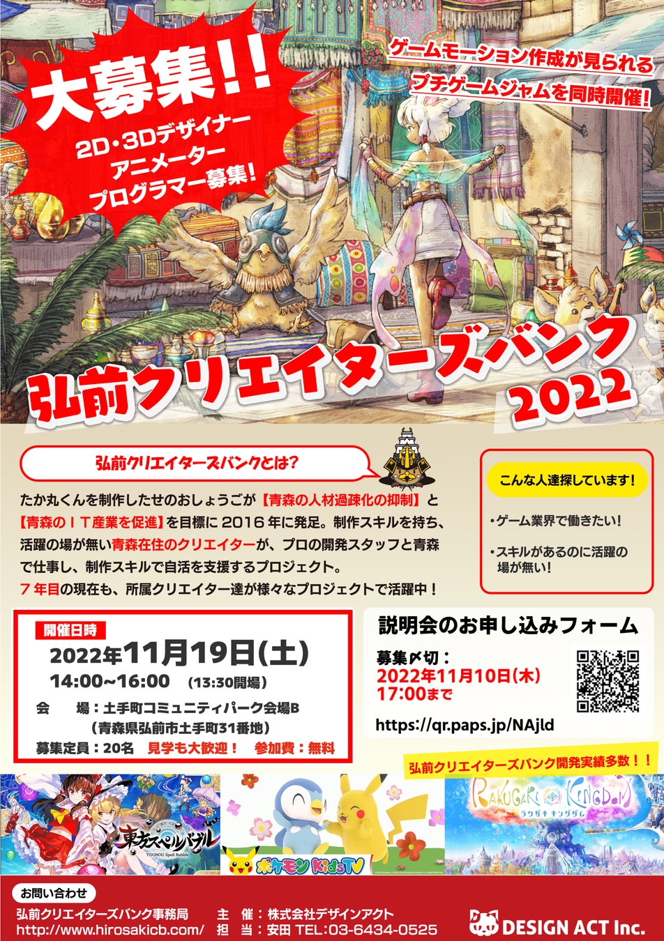 【弘前クリエイターズバンク】は、東京のゲーム会社である株式会社デザインアクト(http://www.designact.co.jp/)が実施する、青森在住クリエイターとともに仕事をするプロジェクト。今年6年目となるこのプロジェクトでは、現在も多くのクリエイターが活躍しています。