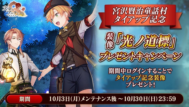宮沢賢治童話村とのタイアップを記念して、期間中ログインすることで「宮沢賢治」の装像「光ノ道標」をプレゼント!