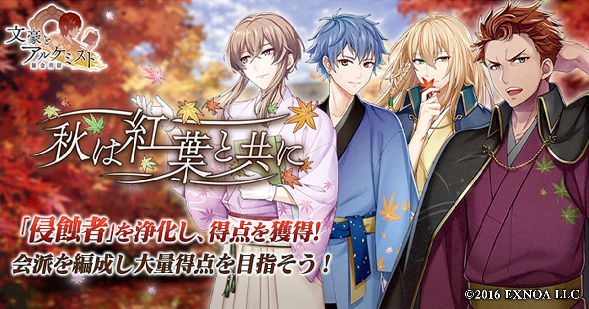 合同会社EXNOA(本社:東京都港区、CEO:村中 悠介、URL:https://games.dmm.com/)が運営するDMM GAMESは、10月3日(月)より、女性向け文豪転生シミュレーションゲーム「文豪とアルケミスト」において、イベント『調査任務「秋は紅葉と共に」』と限定召装『秋は紅葉と共に』を開催いたしました。