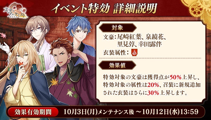 期間中「尾崎紅葉」「泉鏡花」「里見弴」「幸田露伴」の衣装を編成して潜書すると、得点の獲得数がそれぞれ50%上昇します。また、「火」属性の衣装を編成して潜書すると、得点の獲得数がそれぞれ20%上昇します。