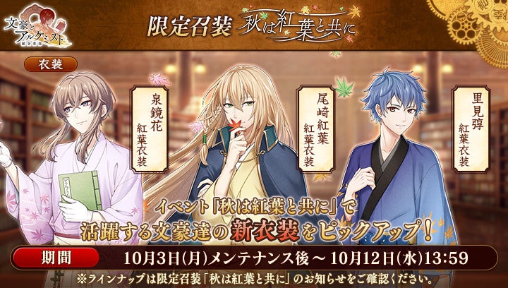 さらに、イベントと同時に開催される限定召装『秋は紅葉と共に』にて新規追加された「尾崎紅葉」「泉鏡花」「里見弴」の〈紅葉衣装〉を編成すると、得点の獲得率がそれぞれ30%上昇します。