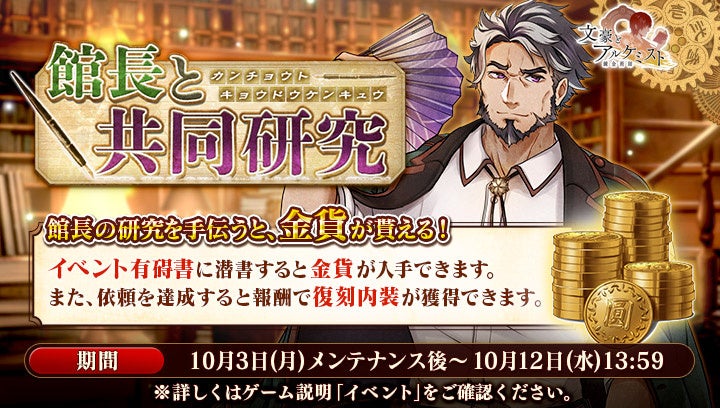 館長の研究を手伝うと金貨が貰えるイベント『館長と共同研究』を開始いたしました。本イベントでは、期間限定アイテム「館長の依頼」を使用することで、金貨を獲得できる専用の有碍書に潜書することができます。