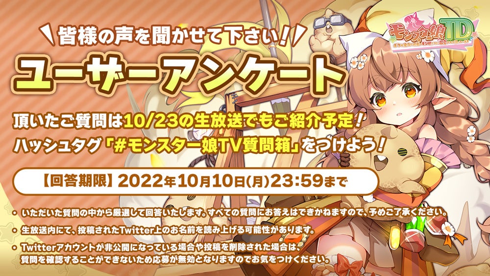 『モンスター娘TD』に関する、ユーザーからの質問を大募集!ハッシュタグ「#モンスター娘TV質問箱」をつけてTwitterに投稿していただくことで、応募が完了となります。期間中、何回でも投稿いただけますので、気になる質問や聞いてみたい話など、ドシドシご応募ください。