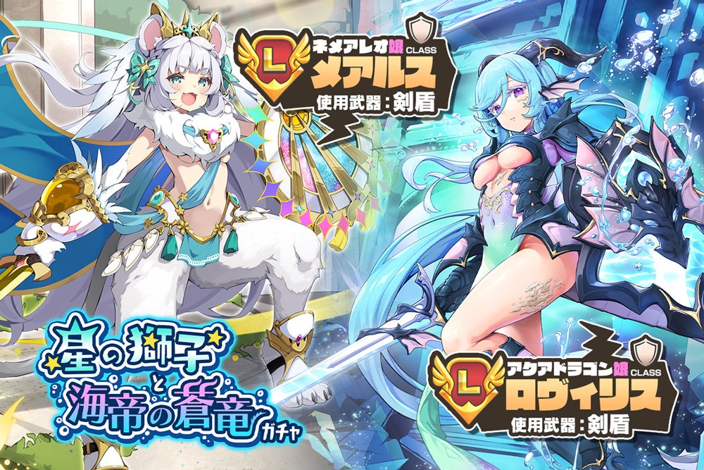 「[ネメアレオ娘] メアルス」「[アクアドラゴン娘] ロヴィリス」が登場する、「星の獅子と海帝の蒼竜ガチャ」を開催中!本ガチャでは、ご利用ごとに「星の獅子と海帝の蒼竜メダル」をおまけとして獲得することができ、入手したメダルの枚数に応じ、専用の交換所でモンスター娘と交換することができます。詳しくはゲーム内のお知らせをご確認ください。