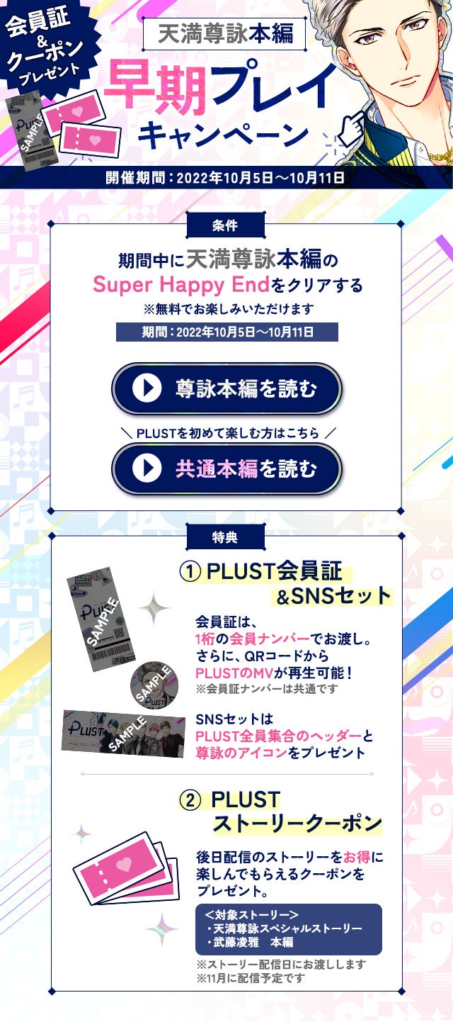10月11日(月)までに天満尊詠本編SuperHappyEndをクリアすると、PLUST会員証&SNSアイコン・ヘッダーをプレゼント!
