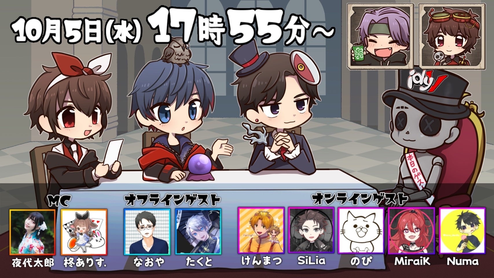 10/5(水)17時55分より、隔週水曜日でレギュラー放送される「Welcome to idyV 〜荘園へようこそ〜」ではidentityV(第五人格)をより多くの方へ楽しんでもらうため、プロ選手や公式キャスターとして大活躍されている配信者が大集結します。実況ストリーマーとしても定評がある「たくと」は、初回放送のオフラインゲストとして出演し番組を盛り上げます。