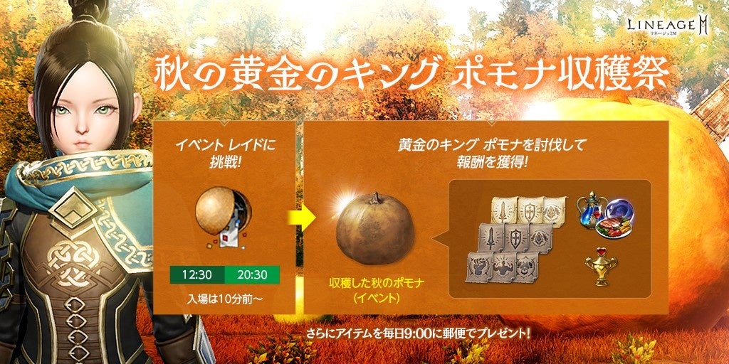 イベント期間中、毎日12時30分と 20時30分に、イベント レイド「秋の黄金のキング ポモナ」が出現します。