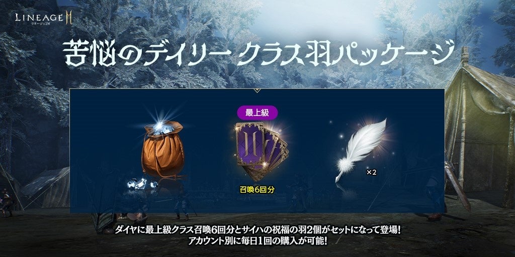 ダイヤと、「サイハの最上級クラス獲得券(6回)(刻印)」1個、「サイハの祝福の羽(刻印)」2個がセットになった「苦悩のデイリー クラス羽パッケージ」が登場しました。