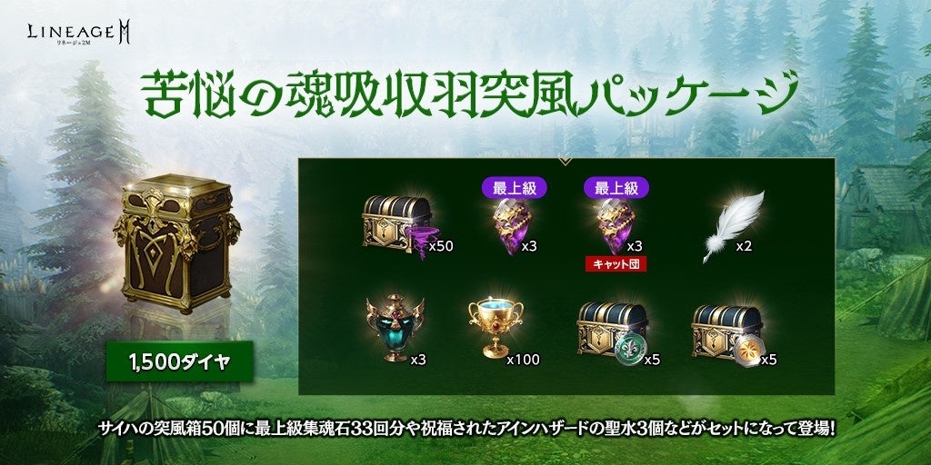 「サイハの突風箱(刻印)」50個や、「サイハの最上級集魂石(11回)(刻印)」3個、「サイハの最上級キャット団集魂石(11回)(刻印)」3個、「祝福されたアインハザードの聖水(刻印)」3個、「サイハの祝福の羽(刻印)」2個などがセットになった「苦悩の魂吸収羽突風パッケージ」が登場しました。