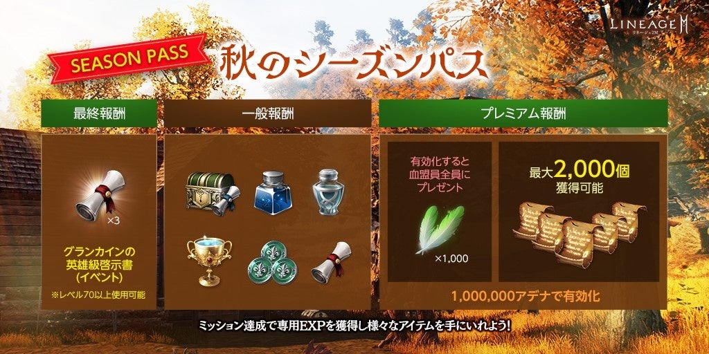 毎日達成していくデイリー ミッションと2週間でクリアを目指すシーズン ミッションで構成された、新規シーズンパス「秋のシーズンパス」が登場します。