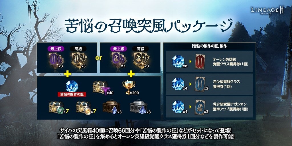 「サイハの突風箱(刻印)」40個に、クラスまたはアガシオンの召喚66回分、「苦悩の製作の証(刻印)」1個などがセットになった「苦悩の召喚突風パッケージ」が登場しました。