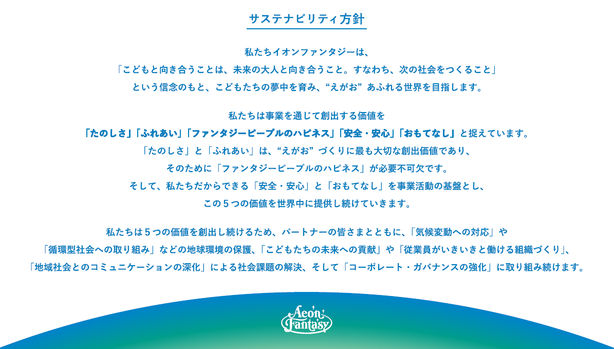 株式会社イオンファンタジー(本社:千葉県千葉市、代表取締役社長:藤原徳也、以下、当社)は、今年4月に制定した「サステナビリティ方針」の実現へ向け、「目標・取り組み」を決定しました。今後、持続的な社会と事業成長の両立を目指し、企業活動の中核としてサステナビリティ経営を進めてまいります。