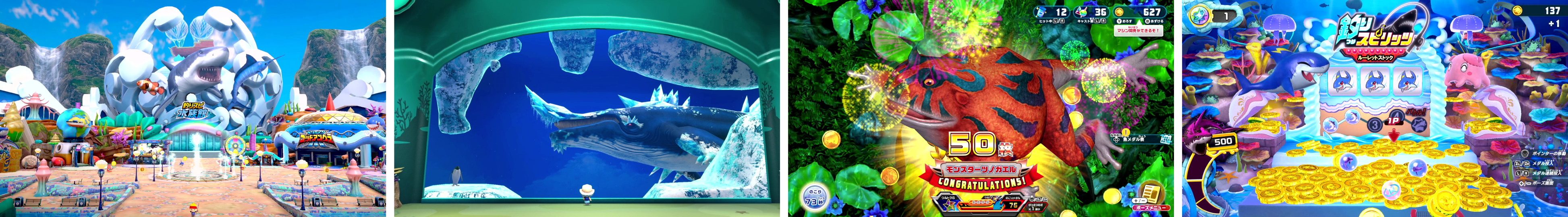 ご家庭で、ゲームセンターで人気の『釣りスピリッツ』が楽しめるメダルモードに加え、釣りで持続可能な海を目指すストーリーモード・シリーズ初のオンライン釣りバトルのほか、ワニワニパニックや金魚すくいで対戦できるパーティーモードやメダル落としゲームなど水の生き物達が登場する遊びの要素が豊富に含まれています。