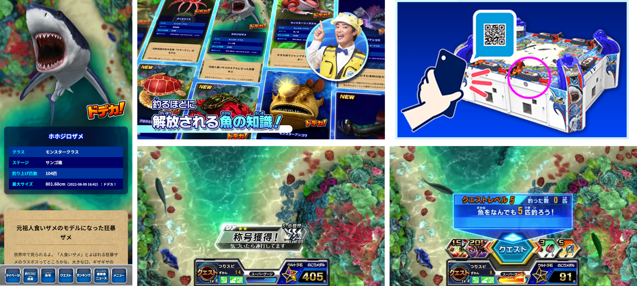 登場する魚は、カクレクマノミなどの小さい魚からホホジロザメなどの大きい魚まで200種類以上。最新バージョン『釣りスピリッツ シンカー』では深海を舞台に、深海魚や季節の旬魚などの魚が順次追加され、全270種以上の魚たちとさらに興奮の釣りバトルを楽しめるようになります。