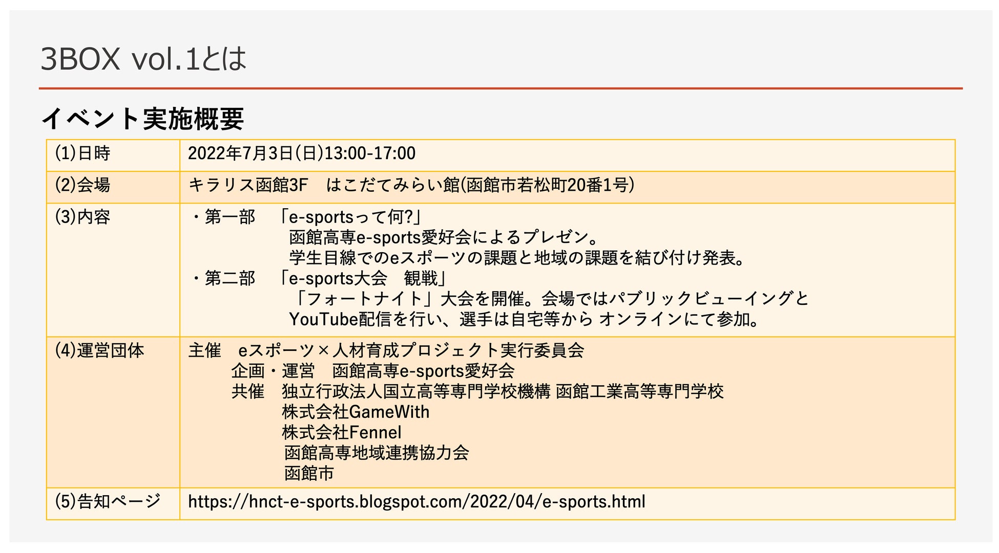 プロeスポーツチーム「FENNEL」を運営する、株式会社Fennel(所在地:東京都渋谷区、代表取締役会長 遠藤 将也、以下「FENNEL」)と、一般社団法人道南eスポーツ協会が発起人となった「eスポーツ×人材育成プロジェクト実行委員会」主催で、函館工業高等専門学校、函館市、函館高専地域連携協力会、産官学の連携のもと、函館高専e-sports愛好会が中心となる学生主体のeスポーツイベント「3BOX Vol.1」を7月3日、はこだてみらい館で開催いたしました。