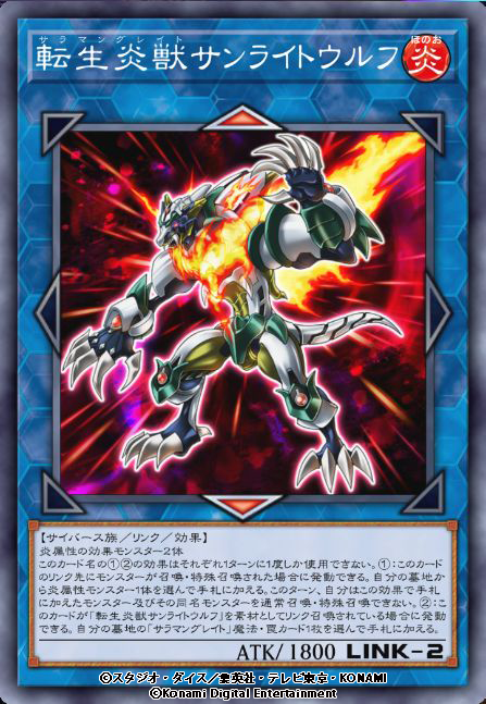 ②:このカードが「転生炎獣サンライトウルフ」を素材としてリンク召喚されている場合に発動できる。自分の墓地の「サラマングレイト」魔法・罠カード1枚を選んで手札に加える。