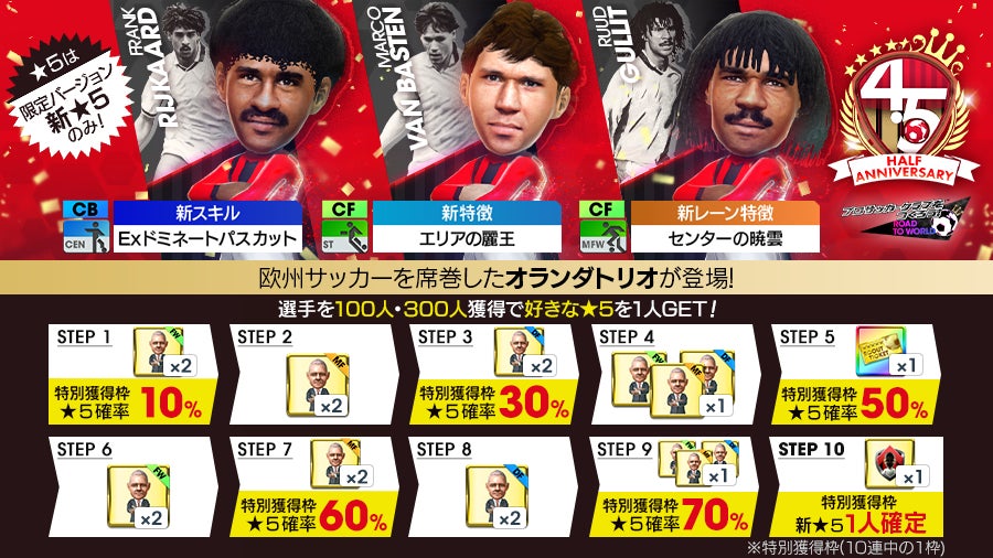 レジェンド「マルコ・ファン・バステン」、「ルート・フリット」、「フランク・ライカールト」、「アレッサンドロ・ネスタ」をはじめ、「ズラタン・イブラヒモビッチ」、「ラデ・クルニッチ」、「ティエムエ・バカヨコ」、「サンドロ・トナーリ」、「マイク・メニャン」といったイタリア強豪クラブのスーパースターたちが、得意戦術「カウンター」の新★5選手として登場する“4.5Half Anniversary LEGEND SCOUT”を開催!