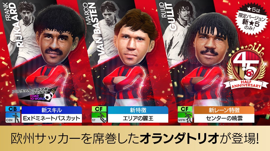 好評配信中のスポーツ育成シミュレーションゲーム『プロサッカークラブをつくろう! ロード・トゥ・ワールド』(以下 「サカつくRTW」)は、2022年10月12日(水)より、イタリア強豪クラブのレジェンド「マルコ・ファン・バステン」、「ルート・フリット」、「フランク・ライカールト」、「アレッサンドロ・ネスタ」や、現役のスーパースターたちが新★5選手として登場する“4.5Half Anniversary LEGEND SCOUT”を開催します。