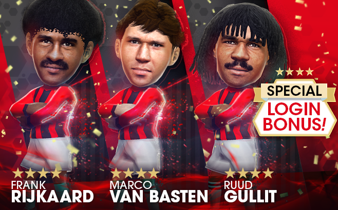 期間中7日間のログインで、「マルコ・ファン・バステン」、「ルート・フリット」、「フランク・ライカールト」、「アレッサンドロ・ネスタ」など、“4.5Half Anniversary LEGEND SCOUT”にもラインナップされた★4バージョンの選手たちが、1日ログインするごとに1名ずつ、合計7名獲得できます。