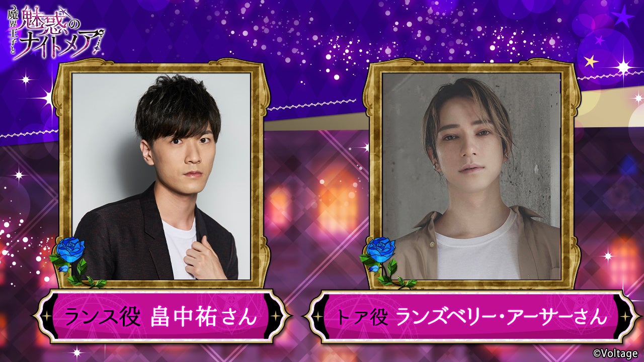 今回の配信では、人気声優の畠中祐さん(ランス・サータ役)とランズベリー・アーサーさん(トア・キフェル役)をお迎えし、 「魔界ナイトメア」にまつわるトークをお届けするほか、ファンの皆様からの要望や質問に答えていくコーナーなど、ここでしか見れない二人のやり取りがお楽しみいただけます。ただいまアプリ内では生配信にむけてアンケートも募集しておりますので、この機会に二人に聞いてみたいことなど質問をお寄せください。
