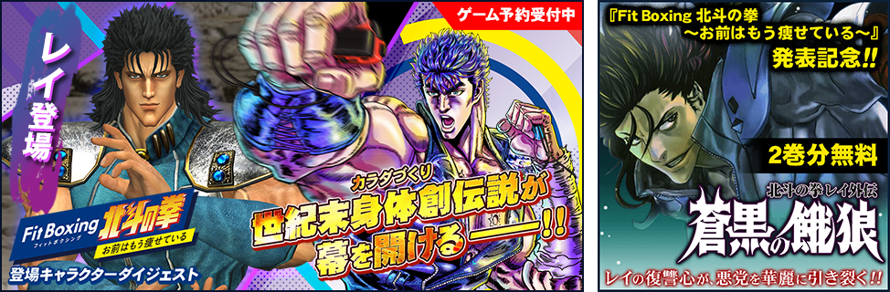 「Fit Boxing 北斗の拳」発売発表を記念して、出版社公式マンガアプリ「マンガほっと」にて、原作「北斗の拳」から「Fit Boxing 北斗の拳」に登場するキャラクターのエピソードを集めたダイジェスト作品を公開しています。本日10月13日より、ダイジェスト作品へのレイのエピソード追加と、あわせて「蒼黒の餓狼 -北斗の拳 レイ外伝-」2巻分が無料で読める、試し読み増量キャンペーンを実施します。