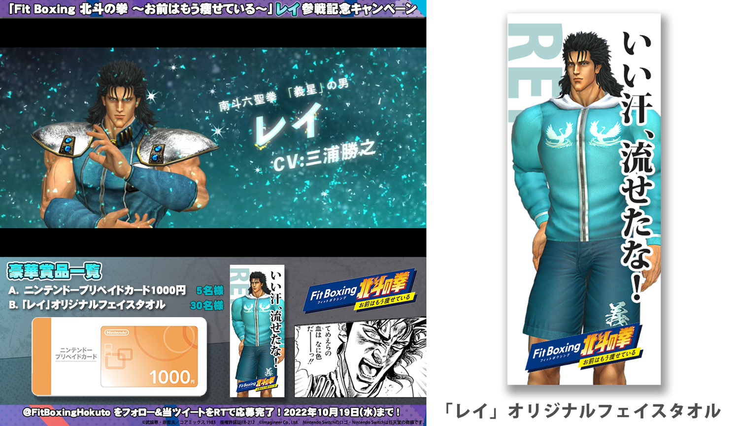 「Fit Boxing 北斗の拳」へのレイの登場を記念して、「レイ」オリジナルフェイスタオルやニンテンドープリペイドカード1,000円が当たるTwitterキャンペーンを開催します。キャンペーン詳細は「Fit Boxing 北斗の拳」公式Twitterアカウント(https://twitter.com/FitBoxingHokuto)にてご確認ください。