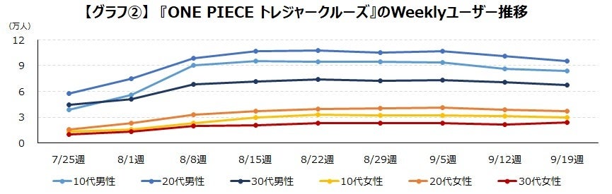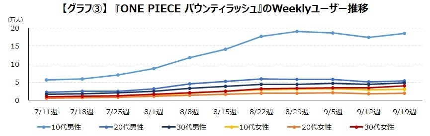 映画が公開された8月1日週から『ONE PIECE トレジャークルーズ』、『ONE PIECE バウンティラッシュ』ともにユーザーが増加しています。これはどちらのゲームも映画公開当日の8月6日からキャラクターの実装などを行っていたことが要因でしょう。増加しているのはこちらも10代男性が中心ですが、『ONE PIECE トレジャークルーズ』に関しては、もともと20代男性が多かったこともあり、20代男性も大きく増加しています。【グラフ➁】【グラフ③】