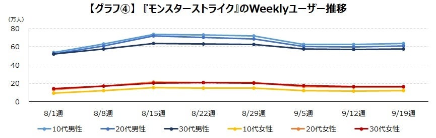 次に『モンスターストライク』を見ていきます。映画「ONE PIECE FILM RED」が公開されて2週間後の8月20日から「ONE PIECE FILM RED」とのコラボイベントが開始されました。8月13日からイベント事前キャンペーンを行ったタイミングでユーザーが増加しています。10~20代の男性を中心に増加しており、8月1日週と8月15日週を比べると、10~20代男性だけで40万人近くユーザーが増加しています。【グラフ④】