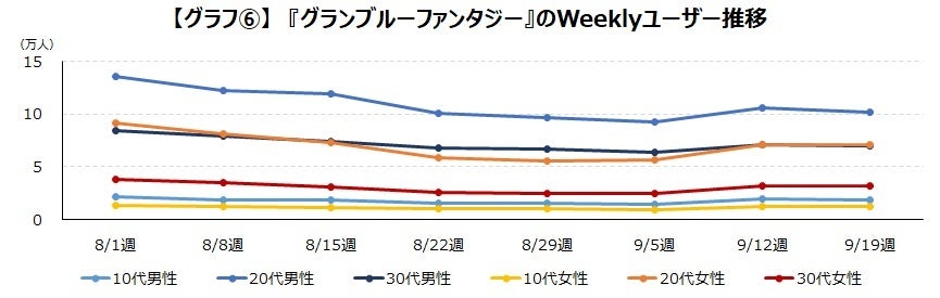 最後にコラボの第6弾である『グランブルーファンタジー』では映画「ONE PIECE FILM RED」の公開1か月半後の9月14日よりイベントが開始されましたが、他タイトルほど増加はみられず、8月の頭に行われていた水着イベントのほうがユーザーを集めていました。【グラフ⑥】