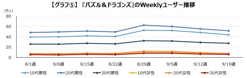 『パズル&ドラゴンズ』は映画「ONE PIECE FILM RED」公開されて約1か月後の9月1日からコラボイベントを開始しており、8月29日週から10~20代男性を中心にユーザー数が増加。しかし、今まで見てきた4つのモバイルゲームと比べると、明らかに増加期間が短くなっています。【グラフ⑤】