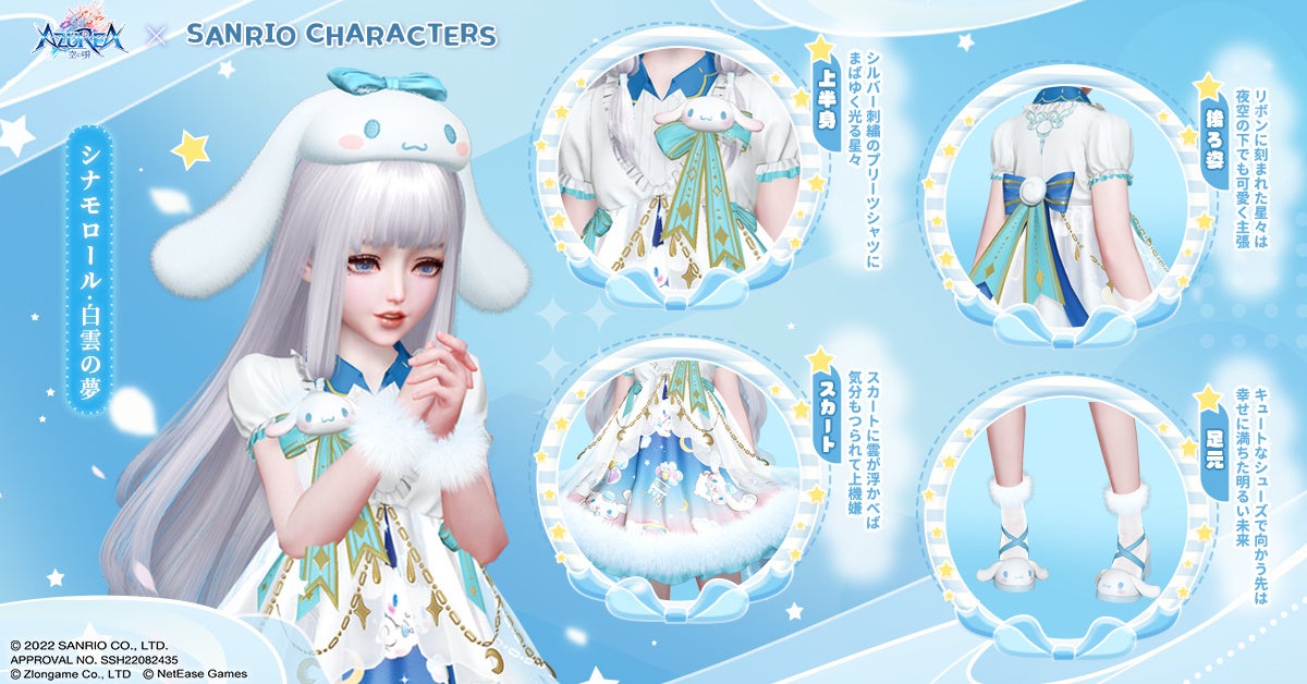 ホワイトとブルーの爽やかカラーをベースに、シナモロールをふんだんにあしらったゆめかわスキンが登場!女性衣装の袖口についたファーや、男性衣装の胸元のシナモロールブローチがチャームポイントです。身に纏ってみれば、気分はサンリオキャラクター!ふわふわ夢心地気分をお届けいたします。