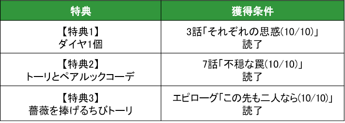トーリの続編ストーリーを期限までに指定の話まで読み終えると、アプリ内アイテムや限定アバターをプレゼント!