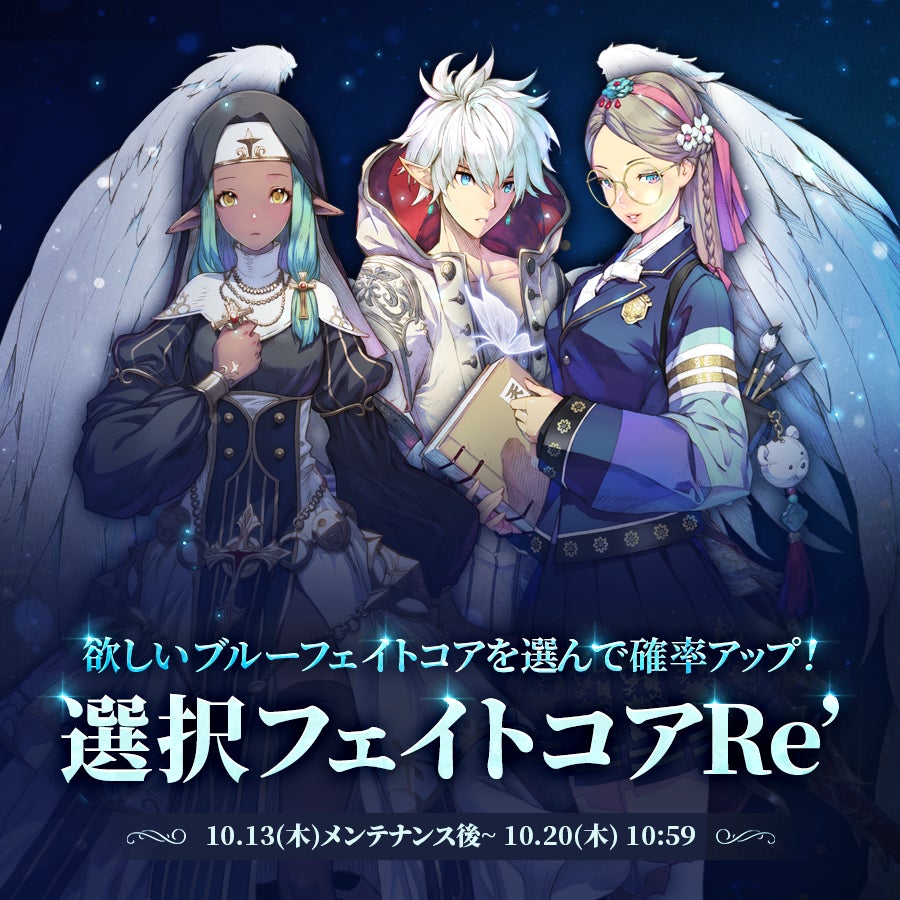 開催期間中は「王位継承者_レイケル」を始め「火山のように情熱的な_トップアーキ」、「ブラックムーン_バラカ」など13体のブルーフェイトコアの内、選択した1体のフェイトコアが通常より高い確率で英雄本体とフェイトコアを一緒に獲得することができます。まだゲットできていないフェイトコアに出会えるチャンスをお見逃しなく!