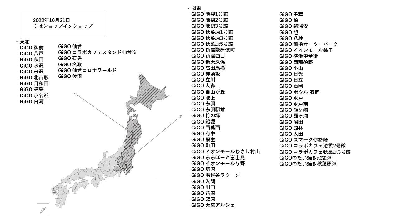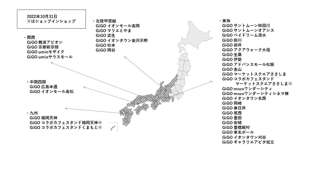 2022年3月9日に『GiGO 池袋1号館』からスタートした新生GiGOは、9月末日時点でに全国で80店舗まで拡大いたしました。10月には、岐阜県、三重県、石川県、福井県、長野県、で各県初の「GiGO」が誕生いたします。また、宮城県、茨城県、千葉県、埼玉県、東京都、静岡県、愛知県、においても新たに19店舗が加わり、富山県には新規店として『GiGO マリエとやま』がオープンいたします。2022年10月1カ月間で28店舗の「GiGO」が誕生いたします。