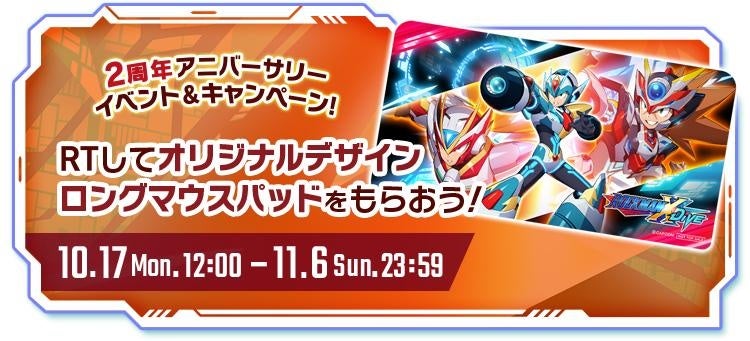 まずは、「ロックマンX DiVE オリジナルデザインロングマウスパッド」が抽選で30名様に当たるTwitterキャンペーンとカプコンデザイナー水野佳祐による特別デザイン壁紙の配布を本日より実施。また、Sキャラ確定入手チャンスがある「2周年記念ありがとうカプセル」や、オリジナルグッズが当たるキャンペーンなどが10月19日(水)より順次スタートします。