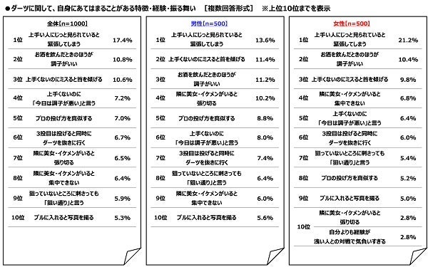 - “ダーツあるある”TOP5 「上手い人にじっと見られていると緊張してしまう」「お酒を飲んだときのほうが調子がいい」「上手くないのにミスると首を傾げる」「上手くないのに『今日は調子が悪い』と言う」「プロの投げ方を真似する」 「隣に美女がいると張り切る」は男性の10%、「隣にイケメンがいると集中できない」は女性の7%