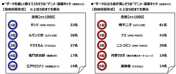また、【“ダーツを優しく教えてくれそうな”アニメ・漫画キャラ(男性キャラ)】では1位「サンジ(ONE PIECE)」(33名)、2位「ルパン三世(ルパン三世)」(28名)、3位「ドラえもん(ドラえもん)」(27名)、【“ダーツの立ち姿が美しそうな”アニメ・漫画キャラ(女性キャラ)】では「峰不二子(ルパン三世)」(81名)がダントツ、2位「ナミ(ONE PIECE)」(43名)、3位「ニコ・ロビン(ONE PIECE)」(39名)となりました。