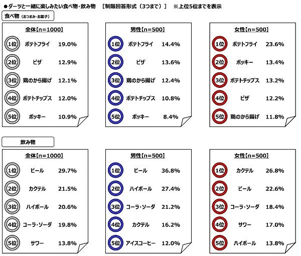 - ダーツと一緒に楽しみたい食べ物 1位「ポテトフライ」2位「ピザ」3位「鶏のから揚げ」4位「ポテトチップス」5位「ポッキー」