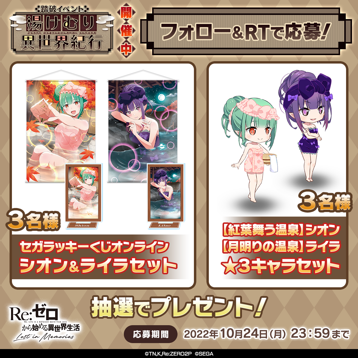 内容:『リゼロス』公式Twitter(https://twitter.com/re_zero_rezelos)をフォロー&キャンペーンツイートをRTすると、抽選で「セガラッキーくじオンライン シオン&ライラセット」を3名様に、「【紅葉舞う温泉】シオン&【月明かりの温泉】ライラ★3キャラセット」を3名様にプレゼントするキャンペーンを開催します。奮ってご参加ください。