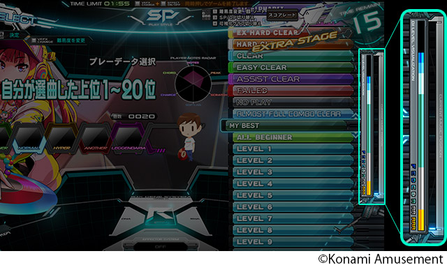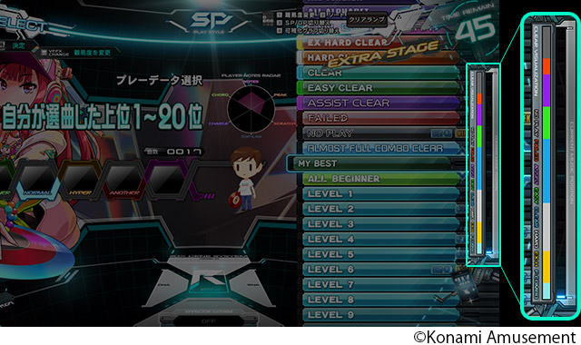 選曲画面で、楽曲のクリア状況を表す「クリアランプ」と、スコアを表す「DJ LEVEL」がカテゴリごとに可視化されるようになりました。