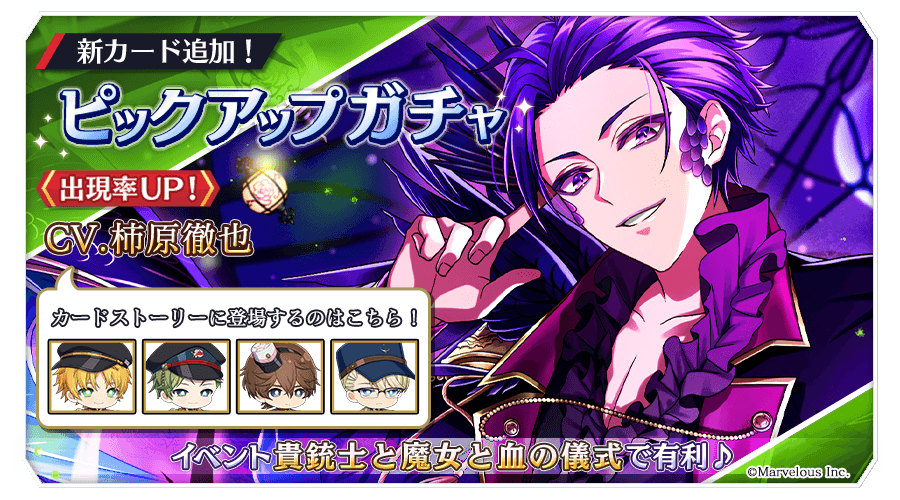 株式会社マーベラス(代表取締役社長:佐藤 澄宣/所在地:東京都品川区)による、スマートフォンゲーム『千銃士:Rhodoknight』(読み:せんじゅうし ろーどないと 以降、『千銃士R』)は、本日よりストーリーイベント「貴銃士と魔女と血の儀式」を開催いたします。本イベントではイベント限定ストーリーが読める他、プロローグ読了で★2「ローレンツ(CV:西山宏太朗)」のイベント限定カードを獲得できます。イベントにあわせて、イベント内で活躍する★3「スナイダー(CV:柿原徹也)」の新カードがピックアップで登場する期間限定ガチャを開催いたします。