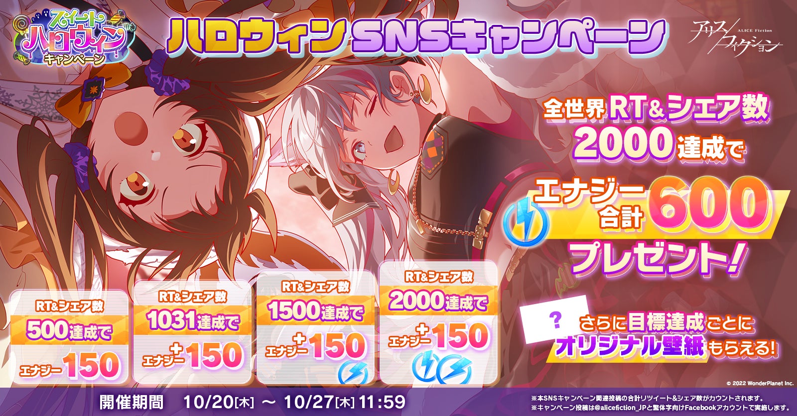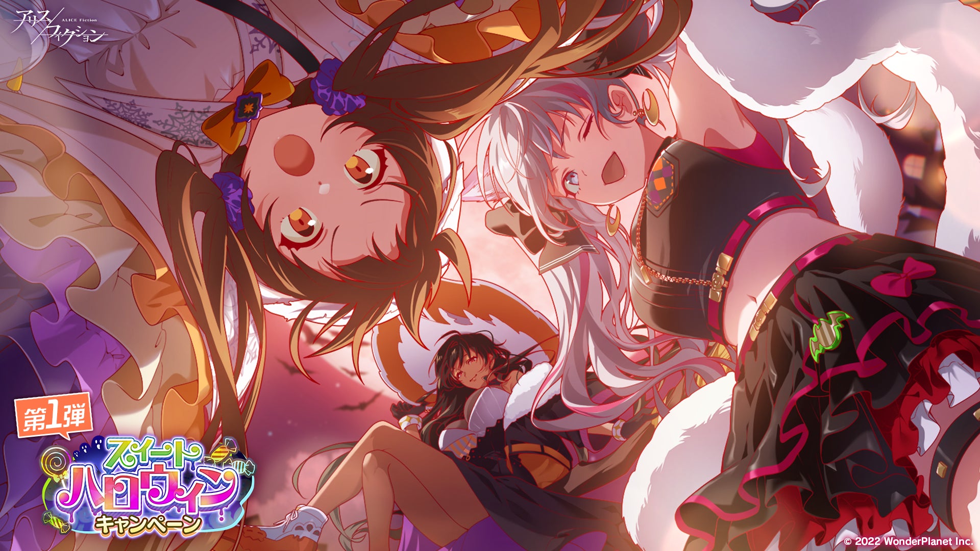 エンターテインメントサービス事業を行うワンダープラネット株式会社(本社:愛知県名古屋市、代表取締役社長CEO:常川友樹、東証グロース:証券コード4199、以下当社)は、好評配信中の新作スマートフォン向けゲーム『アリスフィクション』にて、本日よりハロウィン限定のキャラクターとワールドメモリーが入手できる「スイートハロウィンキャンペーン」第1弾を開催することをお知らせいたします。
