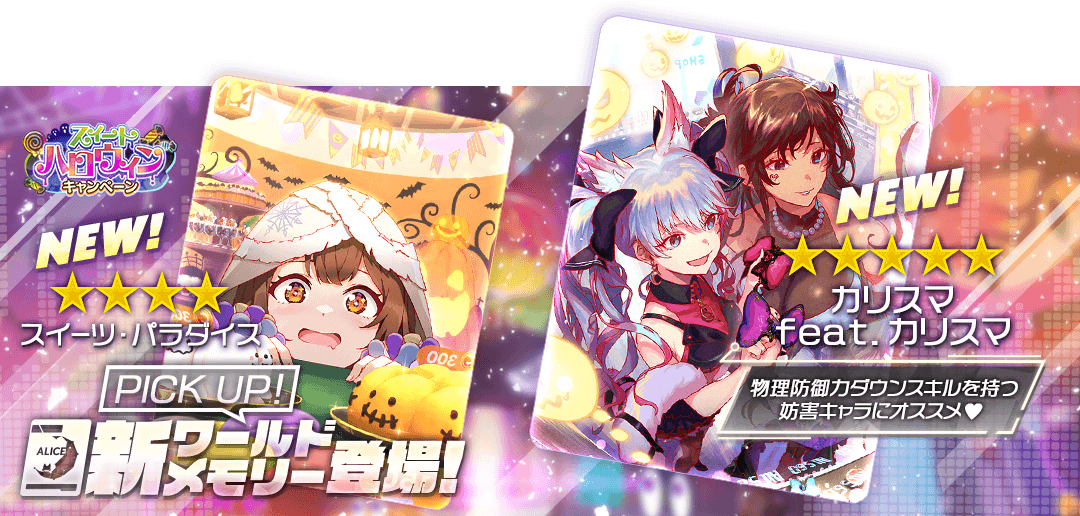 ハロウィン仕様の新ワールドメモリー「★4 スイーツ・パラダイス」と「★5 カリスマ feat. カリスマ」がピックアップガチャに登場!