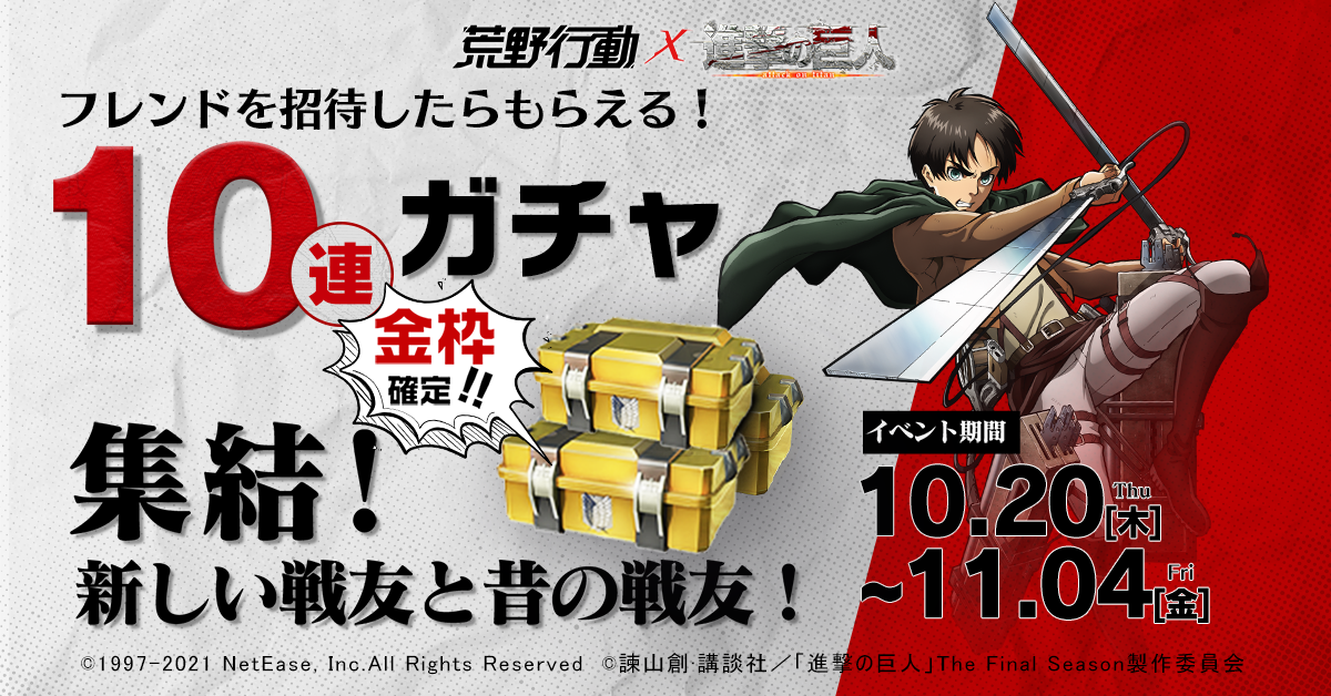 城壁防衛決戦に参加すると、コラボガチャなどのボーナスがもらえます!最後の攻撃には、超強力な鎧の巨人も登場予定です。フレンドとチームを組んで襲来し続ける巨人に立ち向かい、最後の城壁を守りましょう!