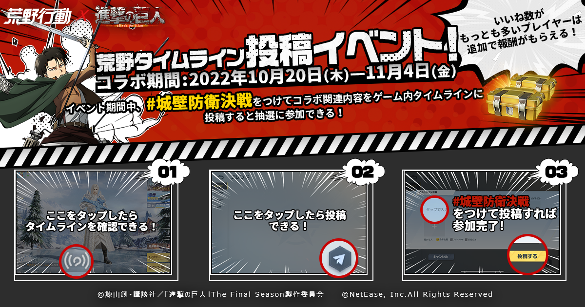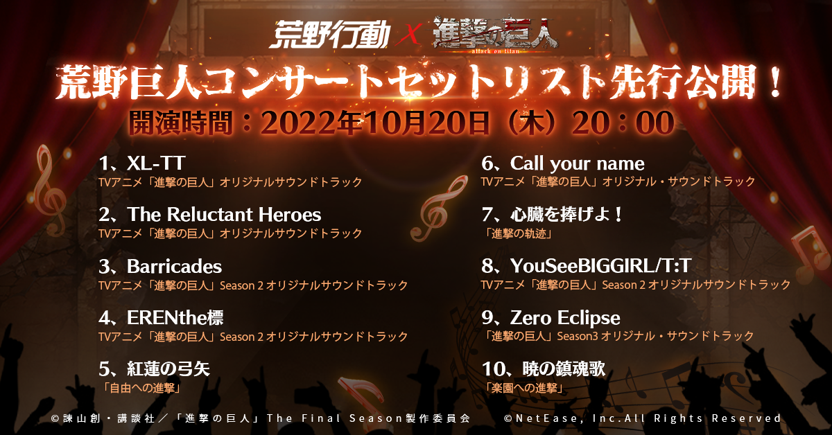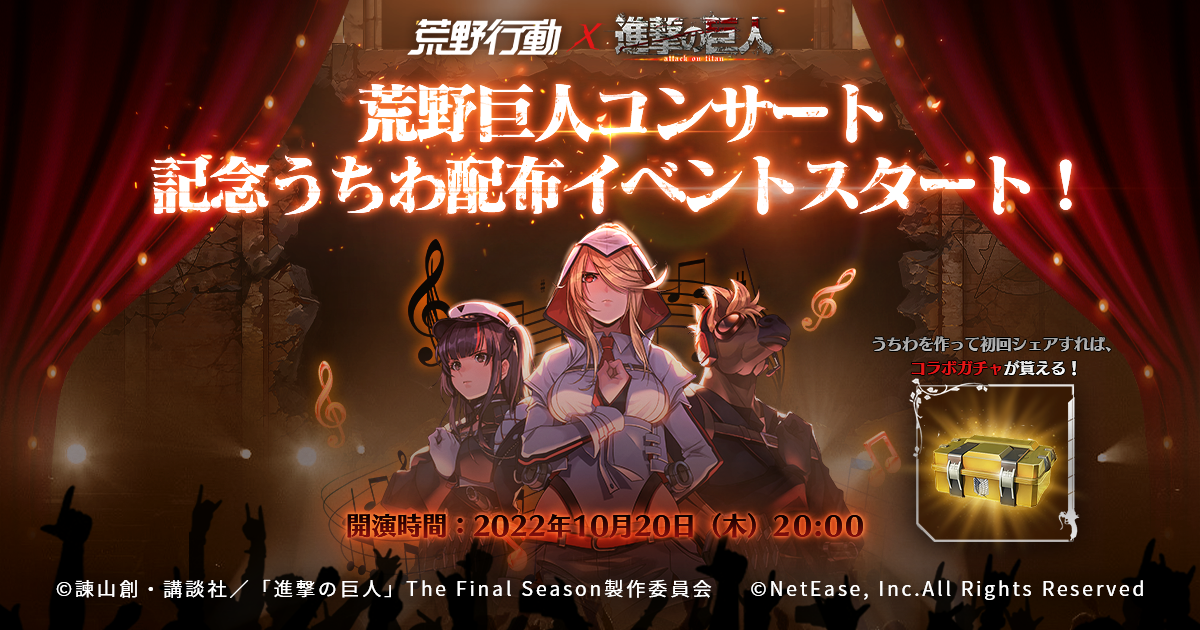 『荒野行動』と『進撃の巨人』のコラボはこれでなんと6度目。今回は「進撃の音、荒野に響け」をテーマに、荒野巨人コンサートを開催します!コンサート期間中は、エルヴィン団長とリヴァイ兵長がスペシャルゲストキャラクターとして登場します!