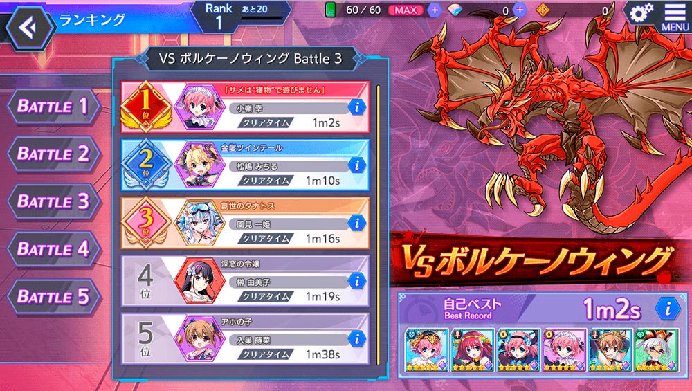 各バトル毎にランキングが追加され、ランキング上位のユーザー名およびクリアタイム・編成PTの情報が掲載されるようになります。新たな力を得たヒロイン達を活躍させる場として、ぜひ挑戦してみてください。