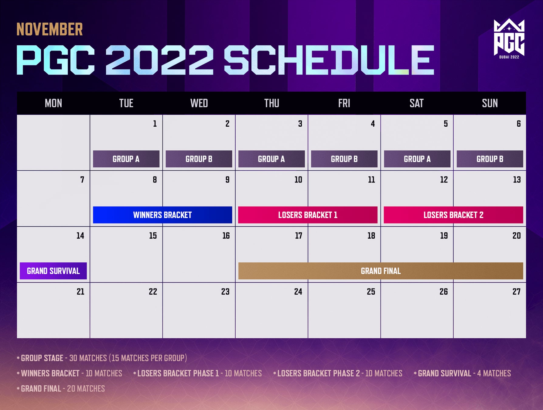 PGC 2022は11月1日(火)から20日(日)まで開催され、アメリカ、ヨーロッパ、アジア、APACのチームが賞金を獲得するために競い合います。PGC 2022の詳細なスケジュールは以下をご覧ください。
