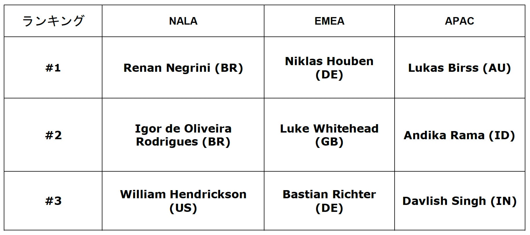 手に汗握る決勝戦では、EMEAのニクラス・ホーベン氏(Niklas Houben)、NALAのレナン・ネグリーニ氏(Renan Negrini)、APACのルーカス・ビルス氏(Lukas Birss)の3人のドライバーがチャンピオンに輝きました。