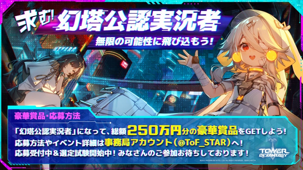 「求む!幻塔公認実況者」の詳細は『幻塔』公式Twitter(@ToF_JP)、『幻塔公認実況者 事務局(@ToF_STAR)』及び下記の特設ページよりご確認いただけます。